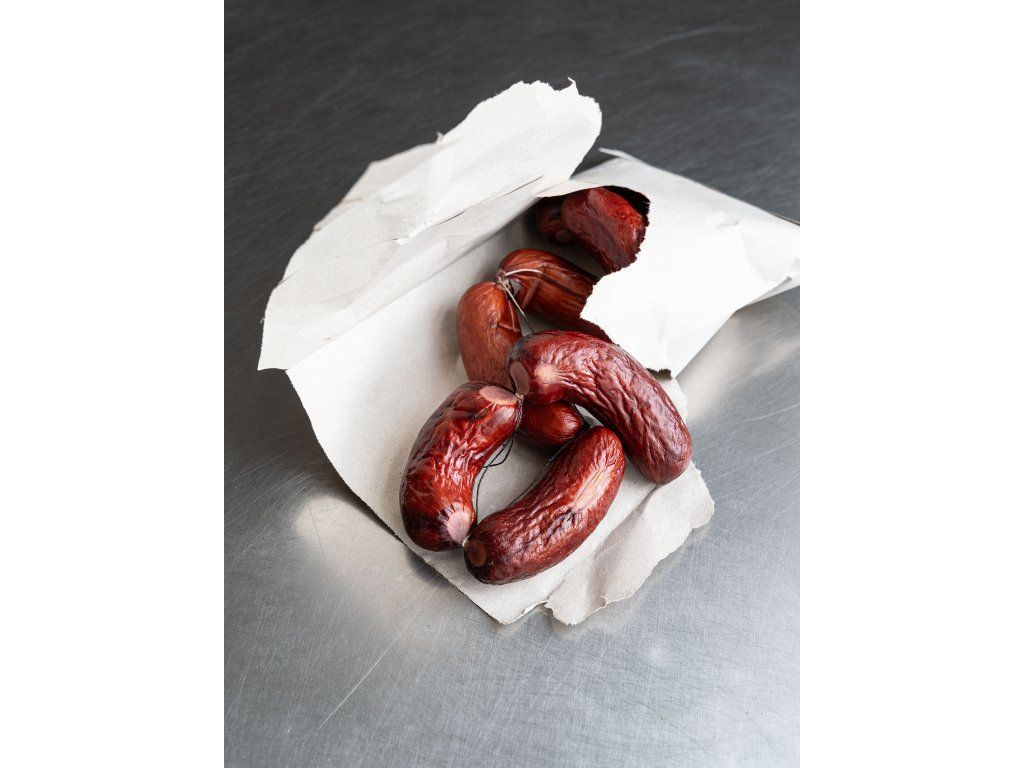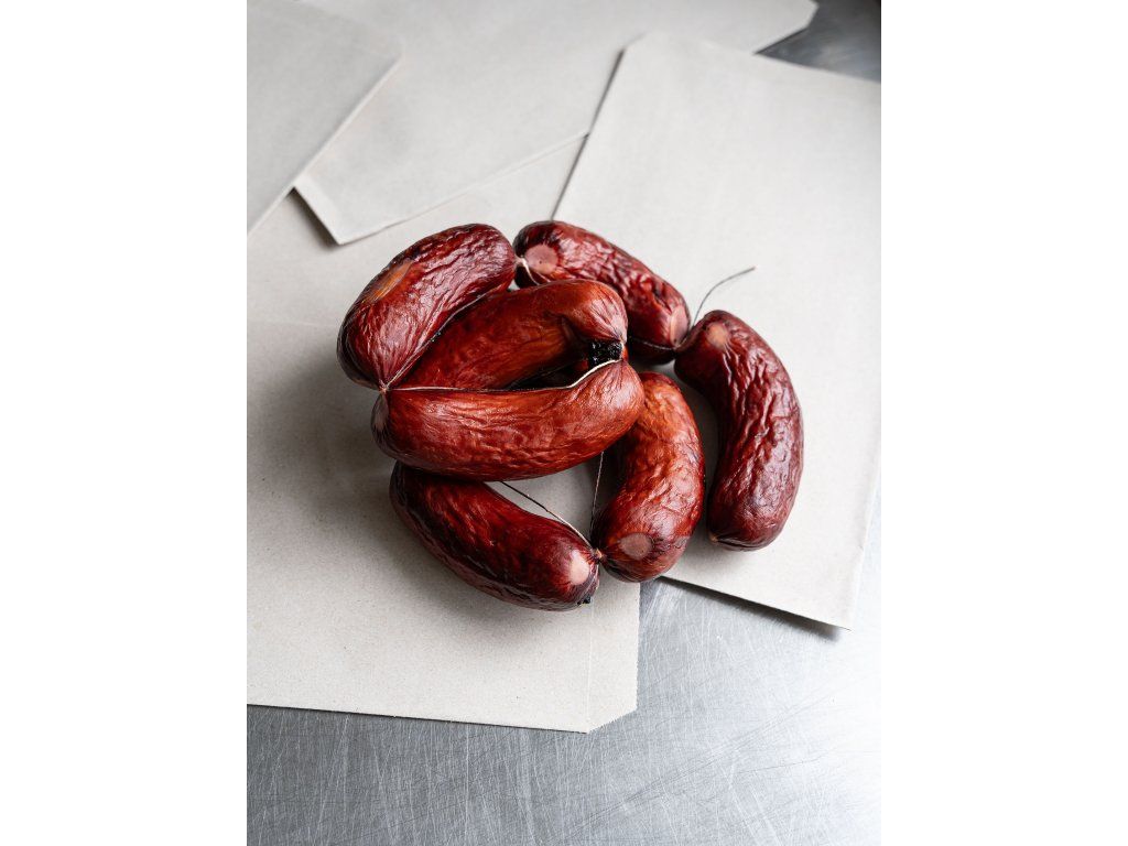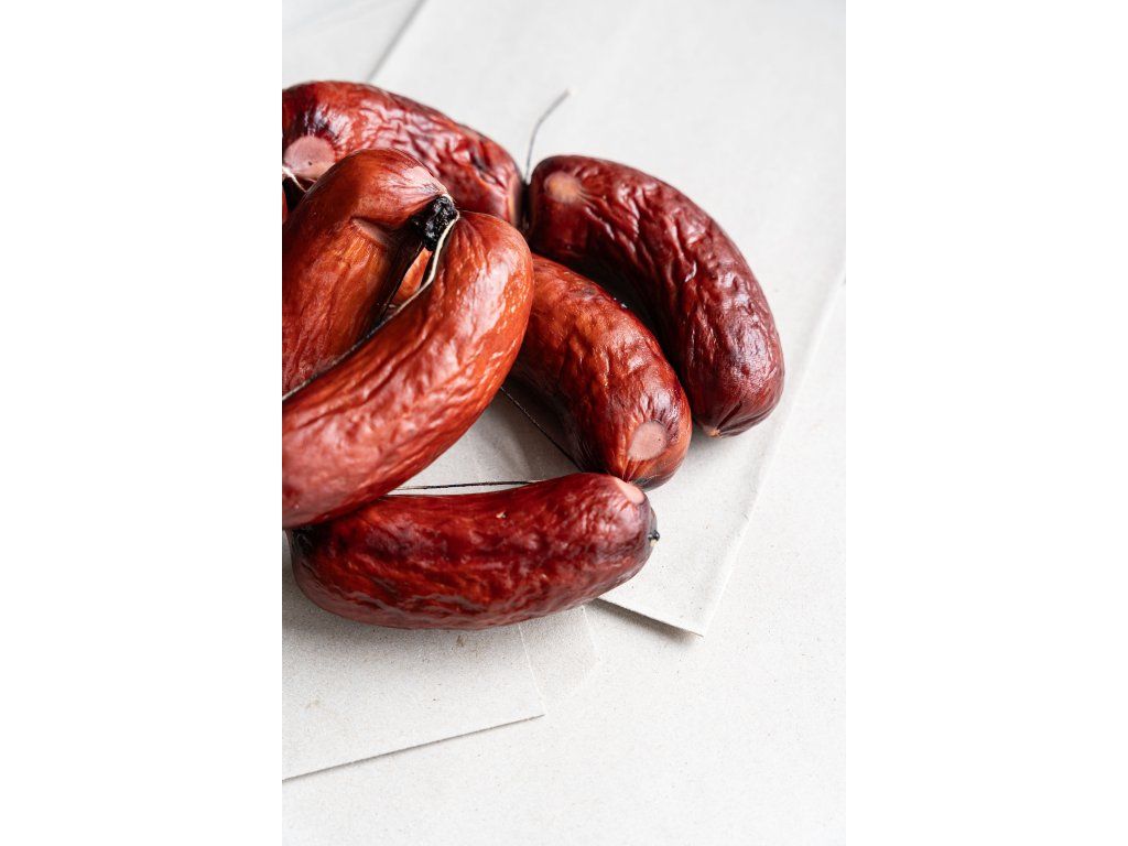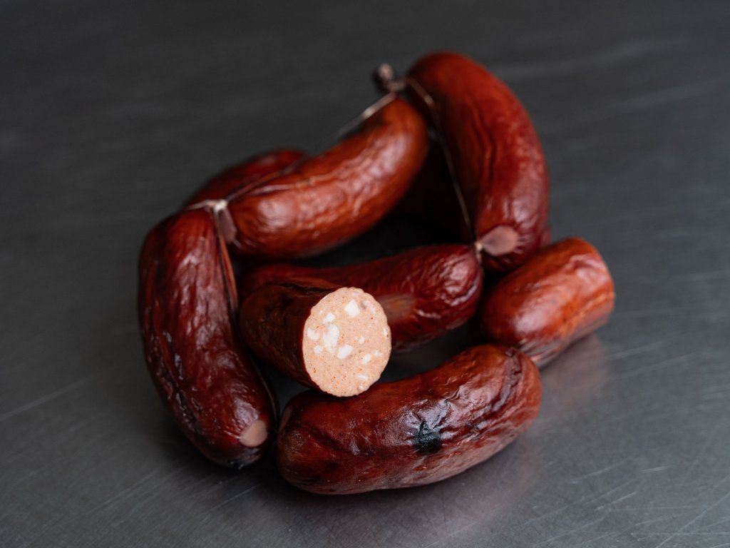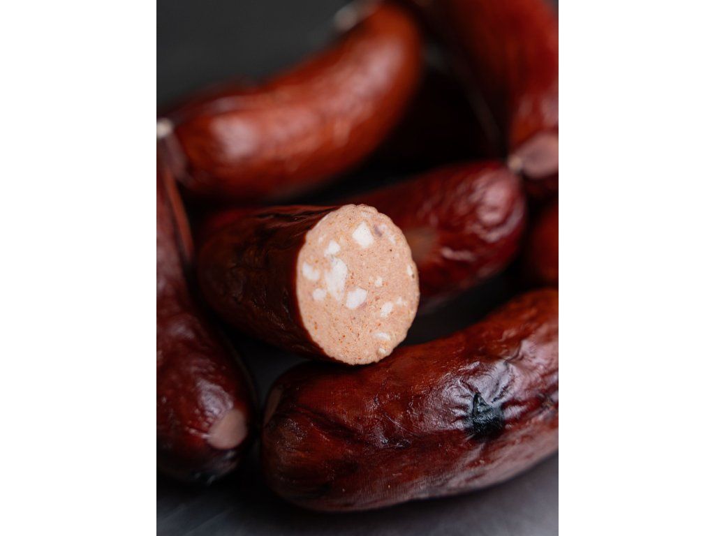 Složení: Složení: Vepřové maso 50%, hovězí maso 15%, vepřové sádlo 15%, voda 15%, sůl, konzervant dusitan sodný E251, koření, glukózový sirup, jedlé hovězí střevo.