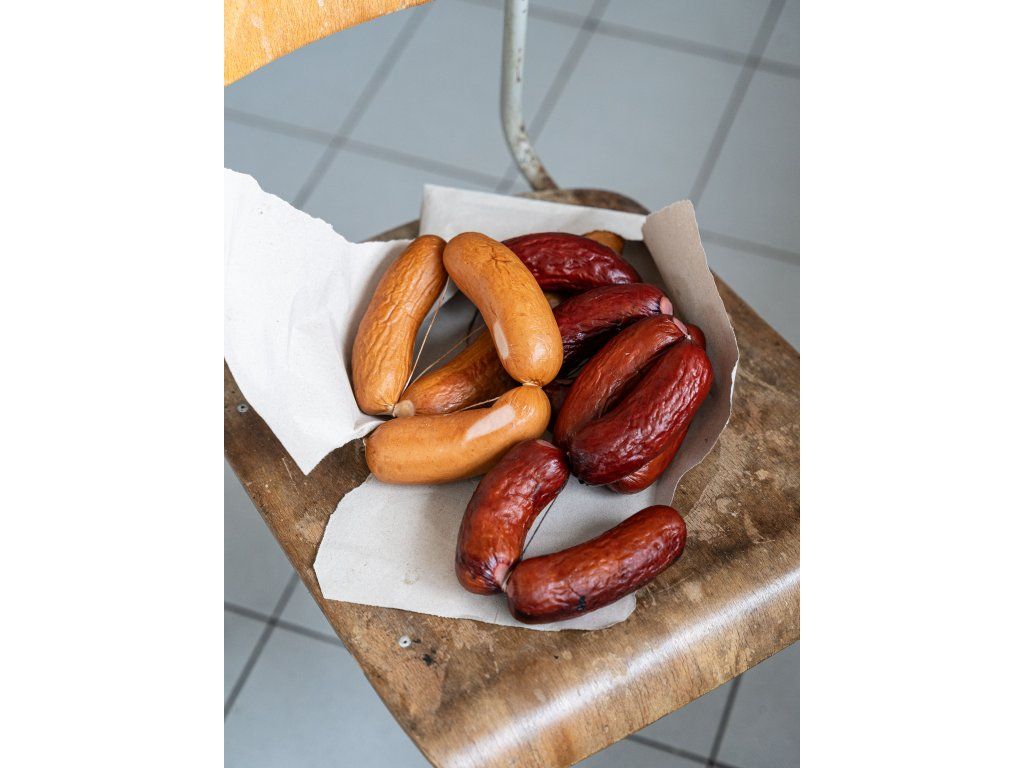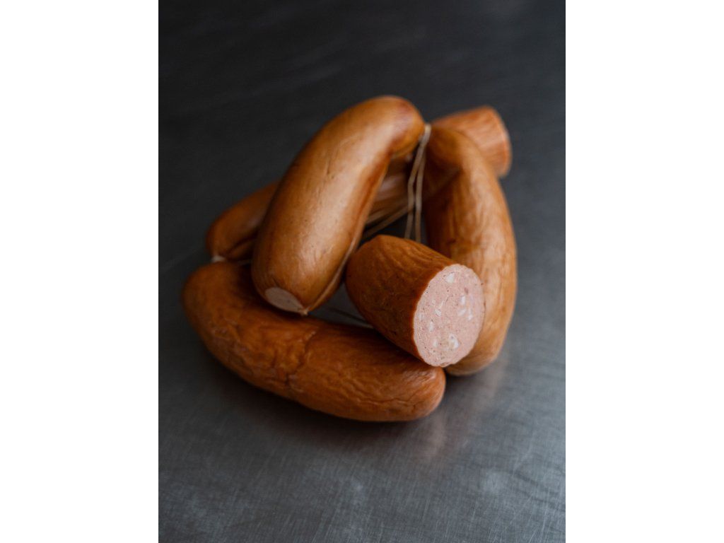 Složení: Složení: Vepřové maso 50%, hovězí maso 15%, vepřové sádlo 15%, voda 15%, sůl, konzervant dusitan sodný E251, koření, glukózový sirup, jedlé hovězí střevo.